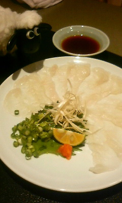 お料理は、てっちり(+雑炊)、てっさ、焼き白子。てっさ、おいしいです。ふぐってもっと食べにくいと思ってたけど、案外すんなり。残すことなくいただきました。ごちそうさまでーす♪