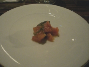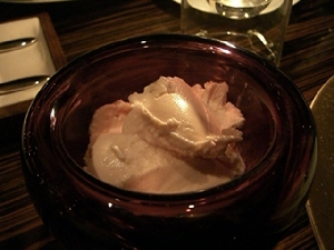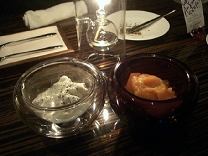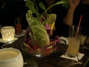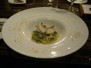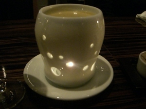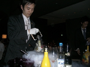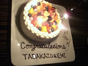 タダカズさんとエミちんの婚約祝いも兼ねたお食事会。婚約というか籍はもう入れちゃってるんだけど。とにかくお祝い。参加人数11人。場所は新丸ビルのAWキッチン。ディナー平均予算8,000円のこういう機会じゃないと行かないお店だったり。土曜日だけど、お店の中は混雑。店員さんもせわしく動いてる。お食事はコース(写真の順番で出てきます)。デザートは、お祝いのケーキ&目の前で液体窒素を混ぜてくれたアイス。お祝いもできたし、食事も美味しく満足。うおちゃんとなすのトークがツボにはまって笑いが止まらなかった(笑)