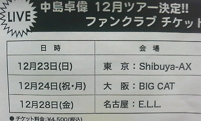 そろそろやるかな~と思ってたら、ありましたよ毎年恒例12月ツアー。しかも、AX!この場所は、2003年12月22日「SILENT摩擦 ~さびしいのは君だけじゃNIGHT~」以来です。あたしが卓偉くんにはまった最初のライブ場所だから思い出たくさん。何歌ってくれるんだろう?って今から楽しみ♪(チケットもこれからなのに)そういえば、年越しライブ今年はやらないのかな?